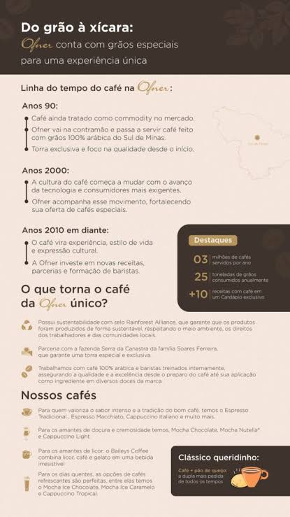Os números impressionam: a Ofner serve cerca de 3 milhões de cafés por ano, o que representa aproximadamente 25 toneladas de grãos consumidos anualmente. Para valorizar ainda mais essa paixão nacional, a marca oferece um menu exclusivo dedicado ao café, com opções que exaltam toda a versatilidade e riqueza de sabores da bebida. Do clássico Espresso Tradicional ao Capuccino, ideal para quem prefere uma experiência mais encorpada, o cardápio contempla todos os gostos. E para os amantes de sabores adocicados, há criações especiais como o Mocha Nutella® e o Baileys® Coffee, perfeitas para adoçar o dia com a singularidade de sabores.