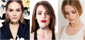 A tendência maior agora são as chokers em cordões de couro, em vários formatos, fazem laços, dão várias voltas no pescoço, ou aquelas com poucos detalhes que lembram uma “coleira”.